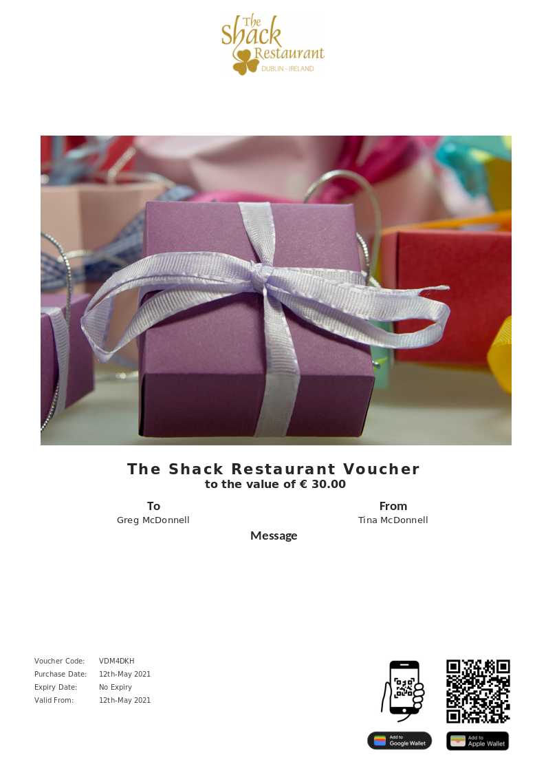 The Shack Restaurant allows you to purchase instantly printable gift vouchers, special offers and tickets using the Voucher Connect platform.